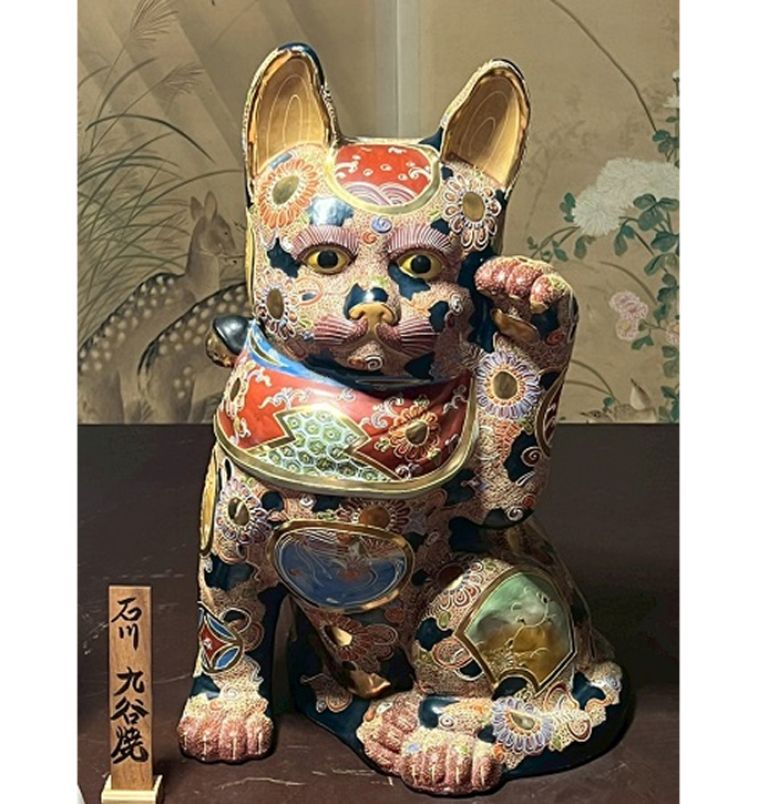 石川県の伝統工芸である九谷焼の鮮やかな色彩と繊細な絵付けが、大型の招き猫に施された贅沢な逸品。 海を渡り、幸運を招くために生まれたこの招き猫は、日本の伝統工芸の技術の高さと、招き猫文化の奥深さを物語っています。